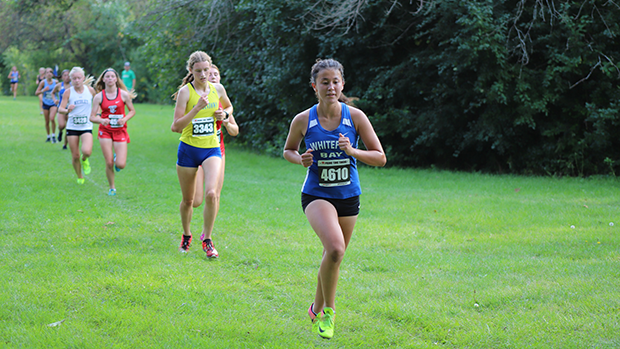 (Whitefish Bay leads the way in the varsity girls race at Thursday night's Whitefish Bay R. Vanden Avond Invitational)